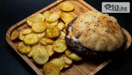 • Блек Ангъс Телешки бургер - телешко месо Блек Ангъс, айсберг, лук, домати, краставици, бургер сос, пържени картофи 450гр.