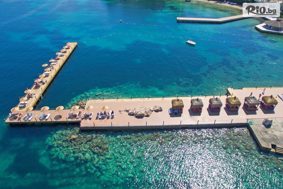 • Собствен пясачно-чакълест плаж и платформа. Шезлонги и плажни чадъри се ползват безплатно.