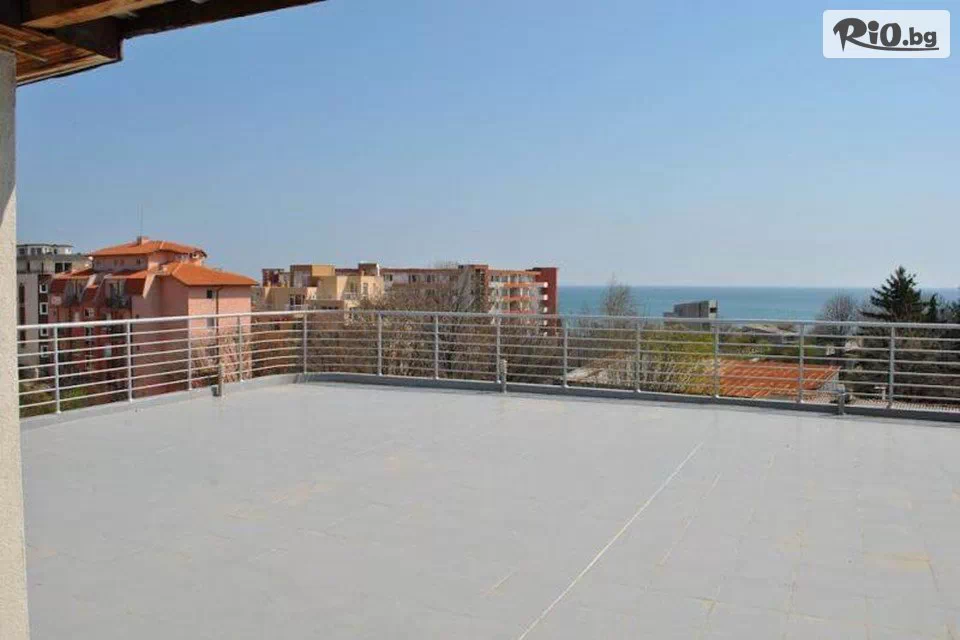 • панорамна тераса с изглед към морето, оборудвана с маса, столове, шезлонги и чадъри.