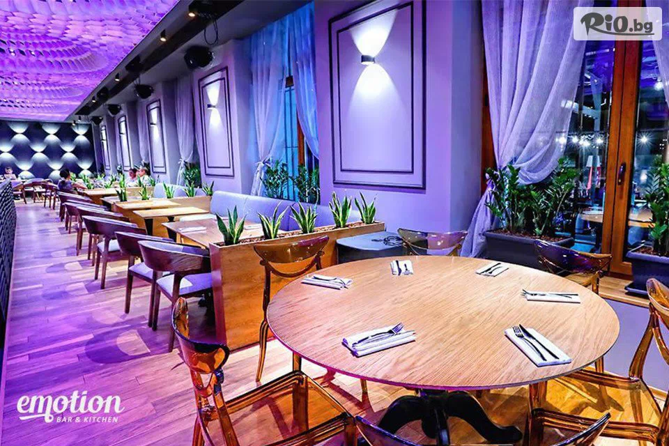 Еmotion Bar & Kitchen е подходящо както за пълноценна ранна закуска и спокоен бизнес обяд, така и за вечеря с приятели или провеждане на грандиозни мероприятия. Забързаното ежедневие също не е предпоставка за спокойно и здравословно хапване. По тази причина тук ще откриете не само стилна атмосфера и вкусна храна, но и перфектно бързо обслужване, което ще ви позволи по-бързо да се насладите на храната и компанията на приятели или делови партньори. Комфортната атмосфера, дискретно обслужване, богатият асортимент от напитки, ритъмът на музиката, танците диско светлените и атрактивните шоу изпълнения - всичко това неминуемо ще зареди с незабравими емоции всеки един от вас.