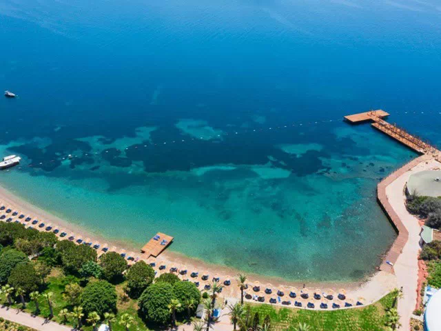 Yasmin Bodrum Resort 5* разполага със собствен плаж - пясък/чакъл и платформа/кей. Ползване на чадъри, шезлонги, плажни хавлии - безплатно.