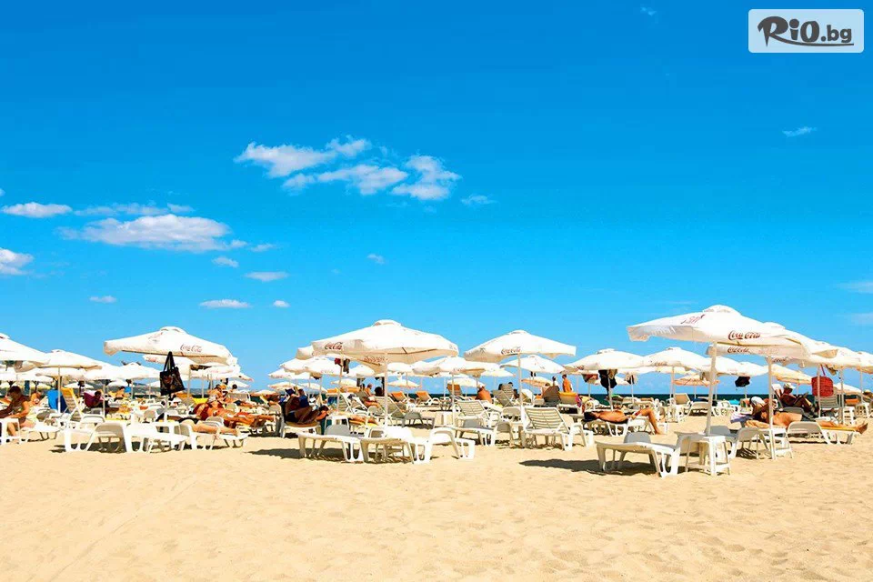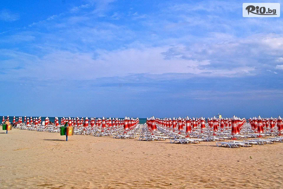 • Безплатно ползване на 1 чадър и 2 шезлонга на плажа (на стая), считано от 3-ти ред откъм морето до плажната алея (до изчерпване на наличните);