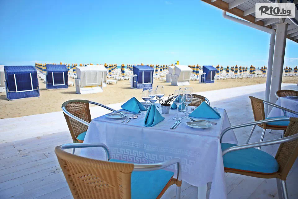 • Безплатно ползване на 1 чадър и 2 шезлонга на плажа (на стая), считано от 3-ти ред откъм морето до плажната алея (до изчерпване на наличните);