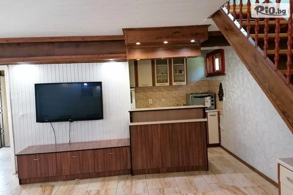 • На първия етаж са разположени хол с мека мебел и холна маса, кухненски бокс, 2 санитарни възела: 1 тоалетна и 1 санитарен възел с баня, тоалетна и джакузи. Кухненският бокс е оборудван с миялна машина, готварска печка, хладилник и кухненски прибори. На втория етаж са разположени три спални помещения. Двете са с двойни легла, а третата стая е с двойно легло и две единични легла.