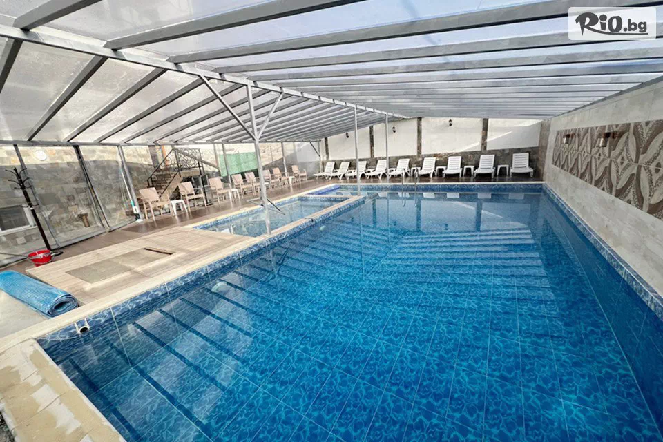• Външен малък минерален басейн с хидромасаж и температура на водата 38 градуса. Външен минерален басейн за плуване с температура на водата 28 градуса.