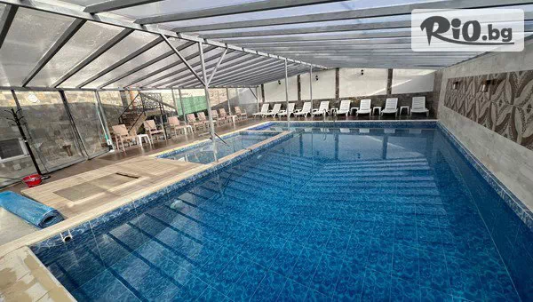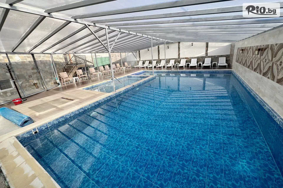 • Външен малък минерален басейн с хидромасаж и температура на водата 38 градуса. Външен минерален басейн за плуване с температура на водата 28 градуса.