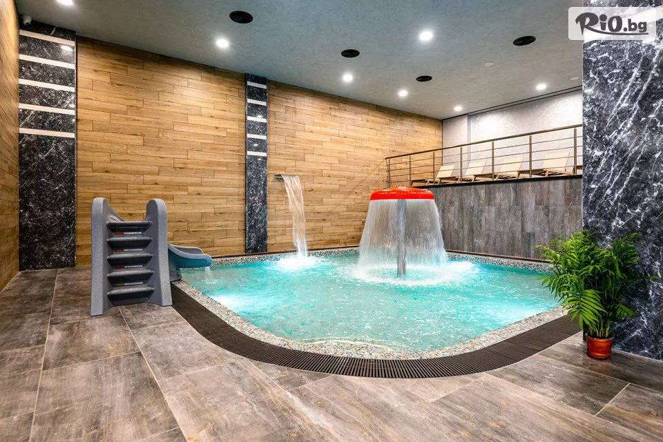 • Голям вътрешен минерален басейн /32°C/ с топла връзка към външно джакузи /32°C/, детски минерален басейн /35°C/, 2 малки минерални басейна - римски и турски /35°C/, вътрешно джакузи /35°C/;