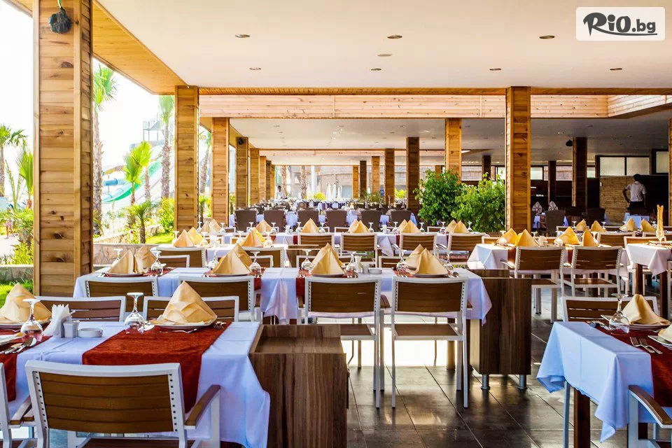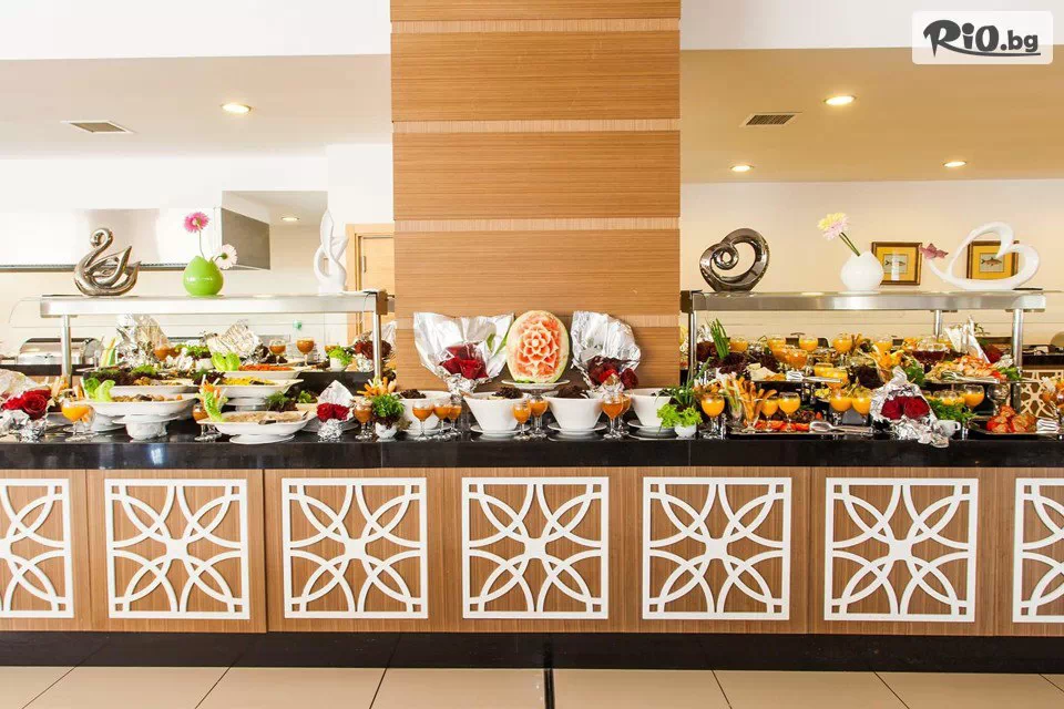 • Хотелът фунционира на база All Inclusive - закуска, обяд и вечеря на блок маса в основния ресторант, допълнителни закуски и неограничена консумация на местни и вносни алкохолни и безалкохолни напитки до 23:00 часа. Безплатно се предлага сладолед на бара на басейна: 14:00 - 16:00 ч.