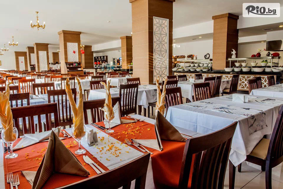 • Хотелът фунционира на база All Inclusive - закуска, обяд и вечеря на блок маса в основния ресторант, допълнителни закуски и неограничена консумация на местни и вносни алкохолни и безалкохолни напитки до 23:00 часа. Безплатно се предлага сладолед на бара на басейна: 14:00 - 16:00 ч.