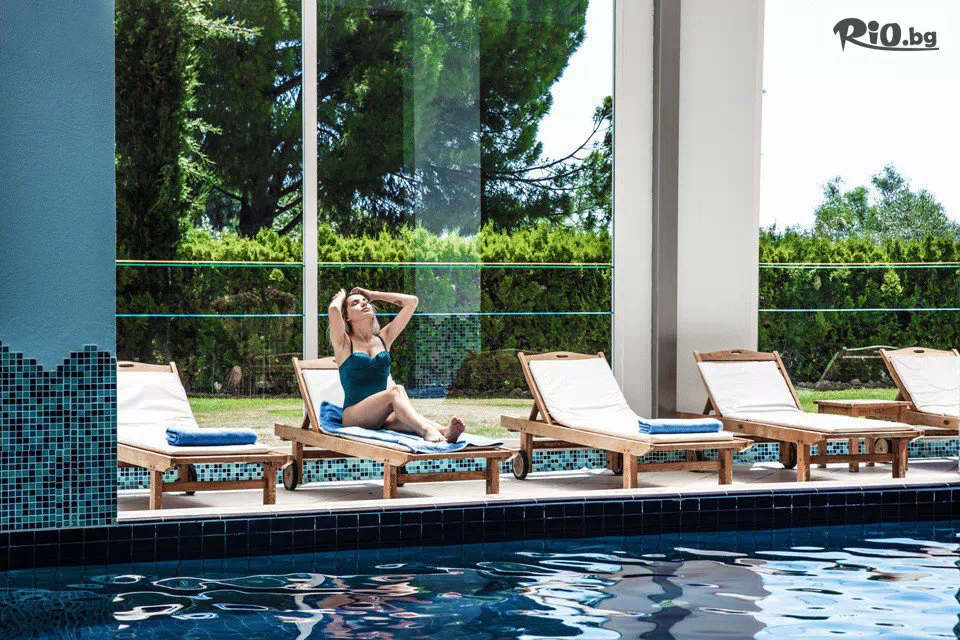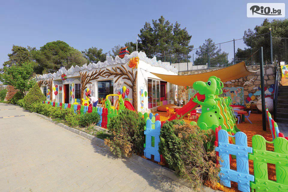 • 2 открити басейна (единият с морска вода), водни пързалки и чадъри и шезлонги на басейните, кърпи за плаж;