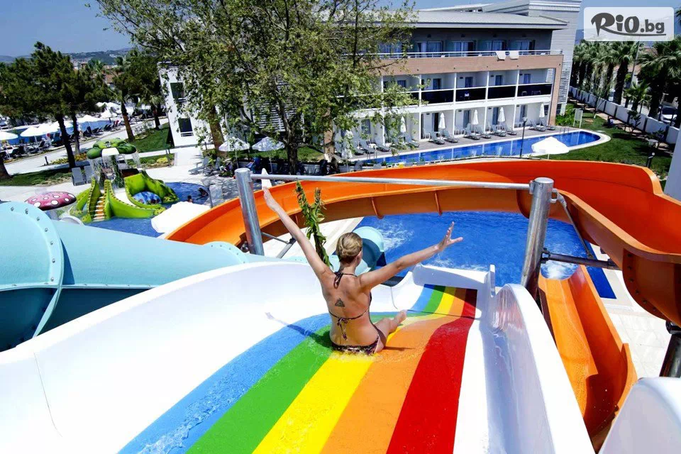 • 10 открити басейна със 7 водни пързалки, 1 основен открит басейн - 1200кв.м., релакс басейн - 500кв.м., закрит басейн - 140кв.м. и детски басейн с водни пързалки - 200кв.м., чадъри и шезлонги на басейните, кърпи за плаж;